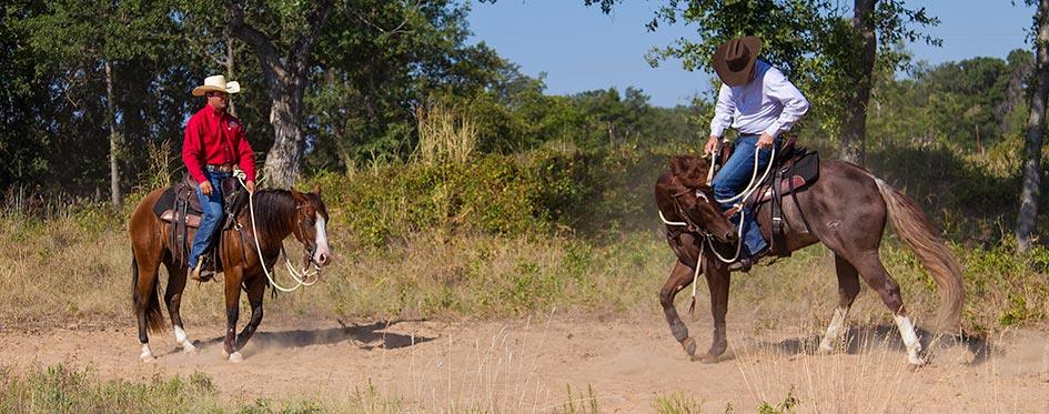 As the other horse is following you, keep the reins or whip in the middle of your chest or over your shoulder so that the horse can’t see it and know that the whack is coming. You want him to honestly think that he’s whacking himself with his ears, and when the whack comes, you want it to shock him. So as you’re riding along, keep the spanker over your shoulder, and as soon as the horse even acts likes he’s going to get snarly, whack him between the ears.