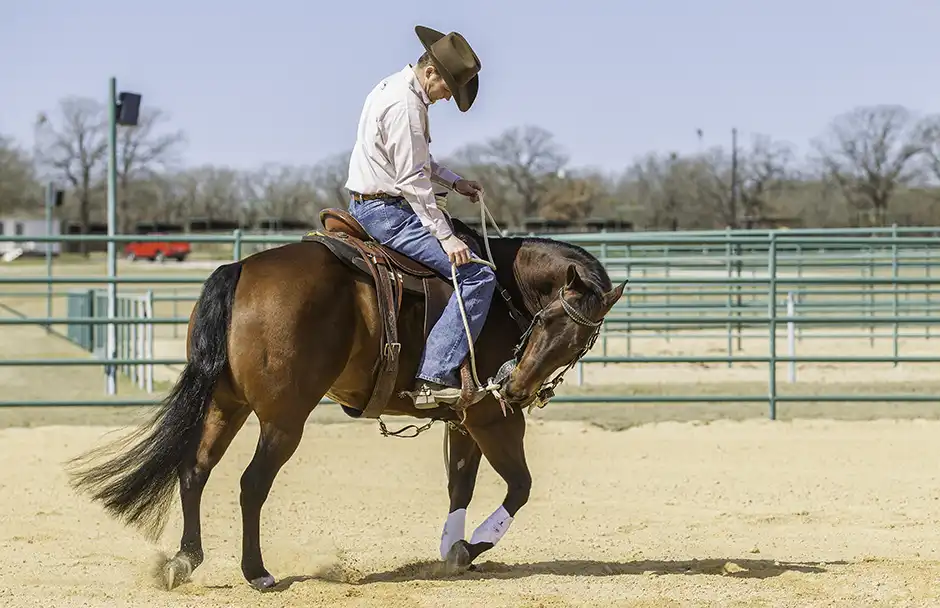 3. What often happens the first time your horse feels the spur is he’ll overreact by throwing his head up in the air and will race around, trying to run away from the spur. That’s why it’s important to keep his head bent around to the side. As long as you have his head bent to the side, if he tries to run away from the spur, he’ll just go in a circle.