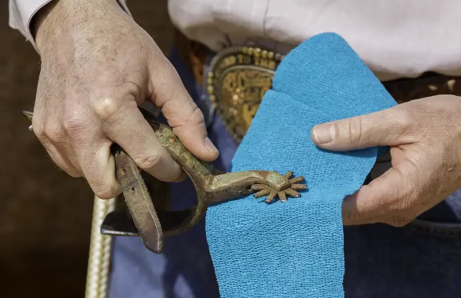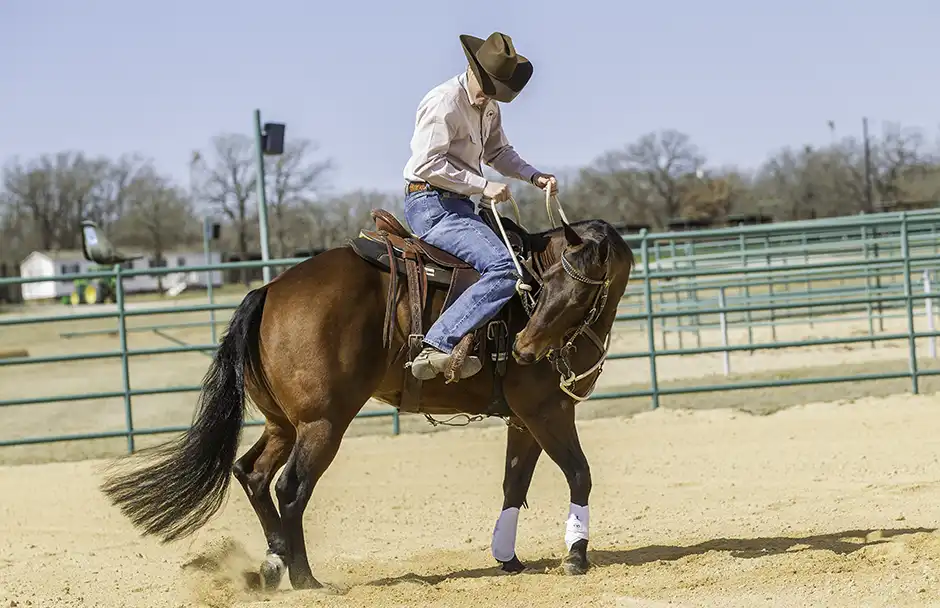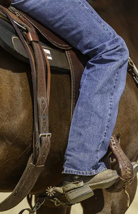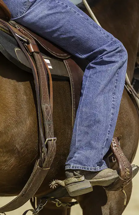 2. When your horse is responding well to the spurs on the ground, it’s time to get in the saddle. Whenever I get in the saddle, regardless of whether I have spurs on or not, I always spend a few minutes flexing my horse’s head from side to side. It’s a way of checking in to make sure he’s soft and not in a hurry to go anywhere. Then, to let him get used to the feeling of the spurs under saddle, I ask him to yield his hindquarters. I keep his head bent to the side and press back behind the back cinch with the calf of my leg. If you’ve done your homework, the horse should move his hindquarters as soon as you apply pressure with the calf of your leg.