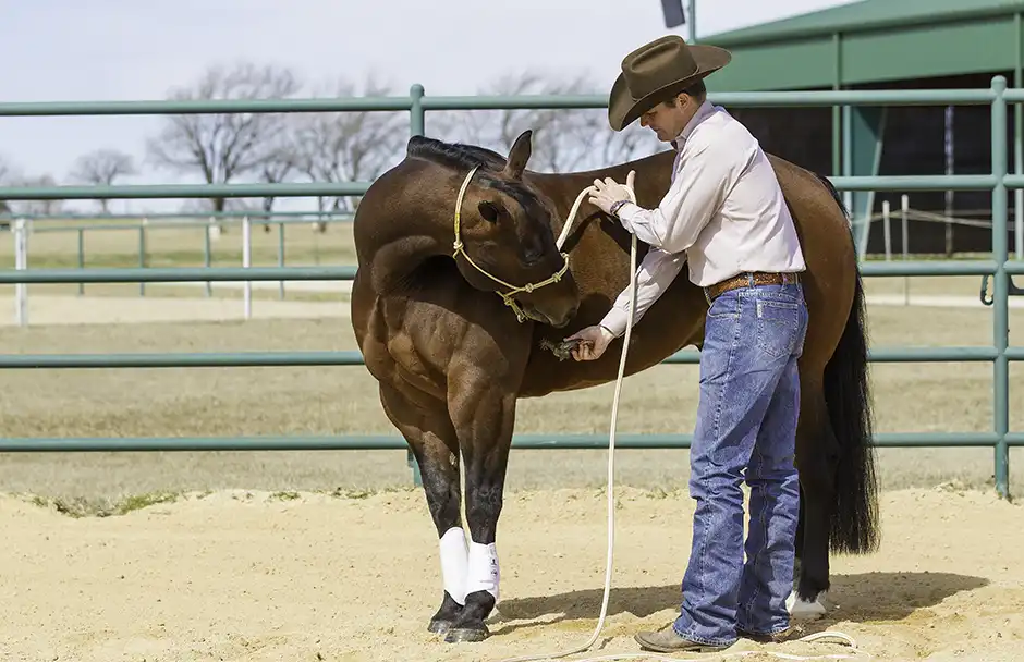 Poke and Flex uses driving pressure on the horse’s ribcage to teach him to bend. You’ll position your horse up against a fence to discourage him from moving away from you when you apply pressure. Then, you’ll pick up on the lead rope with just your fingertips, enough to make contact with the halter. If the horse doesn’t touch his side with his nose by the time you count, “One thousand one,” tell him to give to the pressure by poking him with the spur right behind his elbow, where the girth would be.