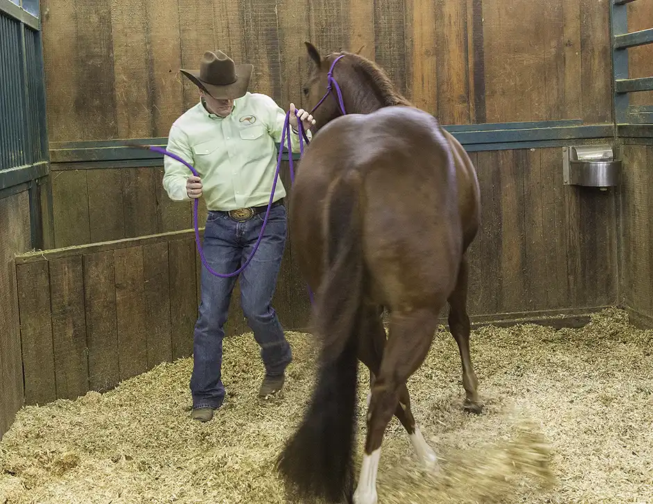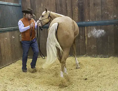 Apply pressure to the horse’s hindquarters to get him to face you with two eyes.
