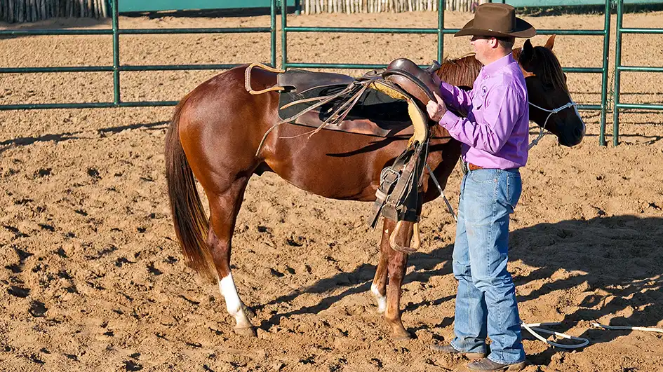 When the horse gets into the water, let him paw it, take a drink, etc. The more he plays in the water and realizes it won’t harm him, the more confident he’ll get about it.