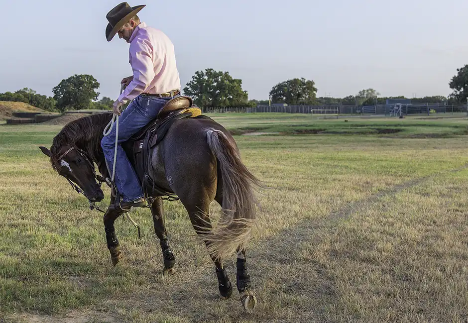 When a horse is frightened of something, his instinct is to get away from whatever is scaring him. In this situation, you’ll use that fear to your advantage. The more fearful your horse is, the more he’ll suck back and want to get away from the water. That fear will cause him to really sit back on his haunches as you roll him back, which helps to improve the maneuver. So as long as he wants to suck back, use that in a positive way.