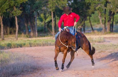 If a horse is flat out galloping, you’ll have to spiral the horse down in a tighter and tighter circle until he eventually stops. Because he’s going so fast, pulling abruptly on one rein could throw him off balance and it’ll take longer to get his feet to stop. The secret there, though, is to not let the horse build his speed up to 90 miles an hour and then worry about how you’re going to stop him. Shut him down before he gets out of control.