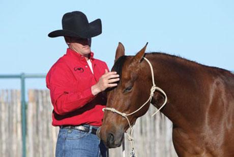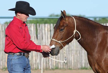 If you find an “Oh no! Don’t touch me there!” spot on your horse, continue to rub him in that same area until he stands still and relaxes. When that happens, retreat and rub him somewhere else on his face or body that he is comfortable with. Then approach the sensitive area again. Continue using this method, called Approach and Retreat, until there are no off-limit spots around your horse’s head.